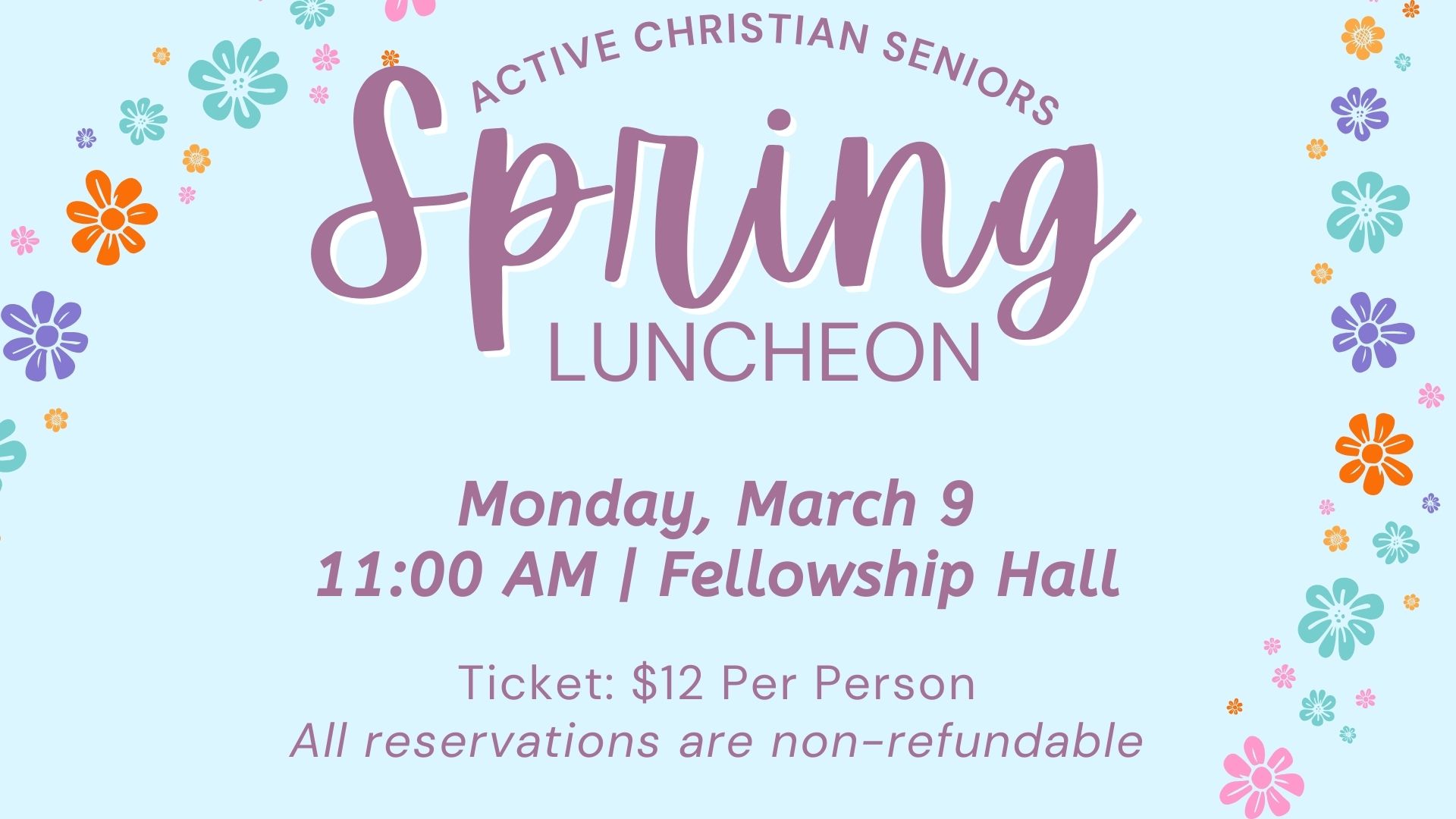 Lunch guests must purchase a ticket in advance of the luncheon – by March 5. You do not need to be a senior to attend! Purchase tickets in the church office Monday – Friday 9:00 AM – 3:00 PM. All reservations are non-refundable.